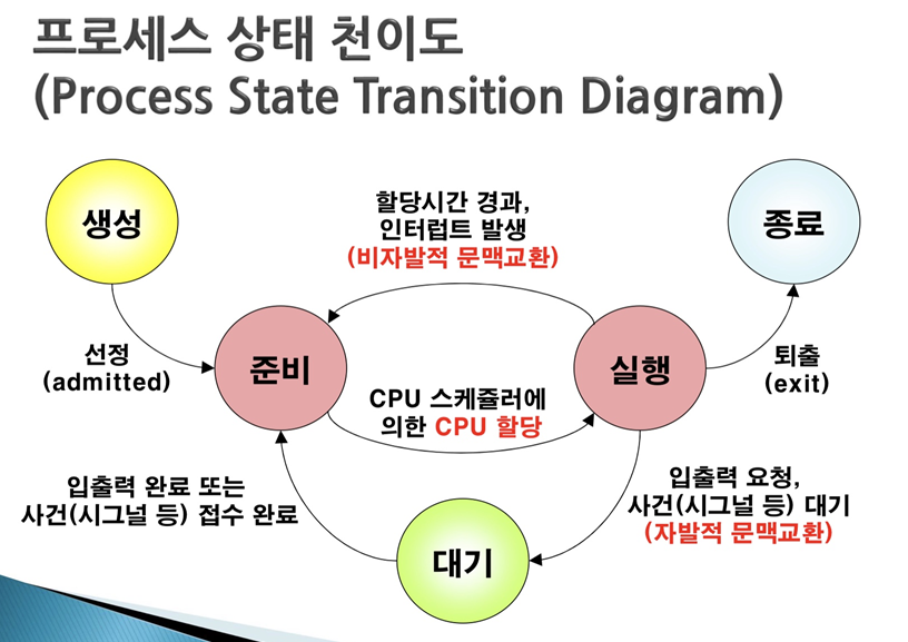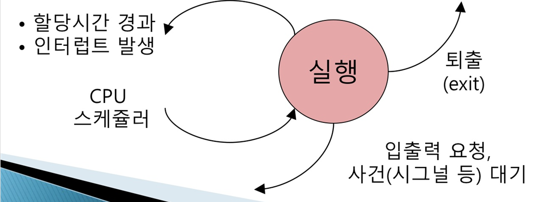 - 사용자 프로세스가 시스템 호출을 통한 입출력 요구나, 사건 발생 대기 중에는 CPU에 의하여 수행될 필요가 없으므로 반납 된다.