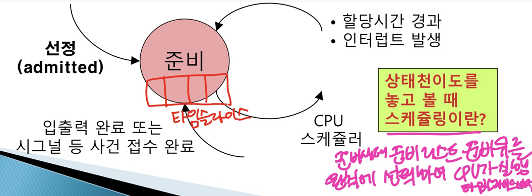 CPU의 배정을 기다리면서 스케줄링(준비큐를 선택하여 CPU가 할당됨에 따라 타임슬라이스가 배정된다.)에 의하여 언제든지 실행이 될 수 있는 상태