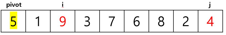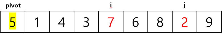 i와 j가 교차하게되면 j는 피벗이 들어가야할 최종 위치가 된다. j를 선택하는 이유는 j의 위치에서 왼쪽들의 값은 피벗보다 작거나 같은 값들이기 때문이다.