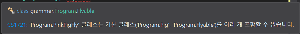 만약 다중상속이 가능하게 되면 아래 코드와 같은 혼종이 나왔을 때 BluePig의 Eat함수를 실행시킬지 PinkPig의 Eat함수를 실행시킬지 알 수 없는 난감한 상황이 발생하면 구조가 꼬이게 된다.