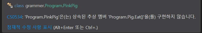 Pig의 자식 클래스에서는 반드시 Eat() 함수를 오버라이딩 해야 한다.