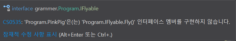상속받은 클래스들은 인터페이스의 멤버를 반드시 구현해줘야한다. 만약 구현하지 않으면 아래와 같은 오류가 발생한다.