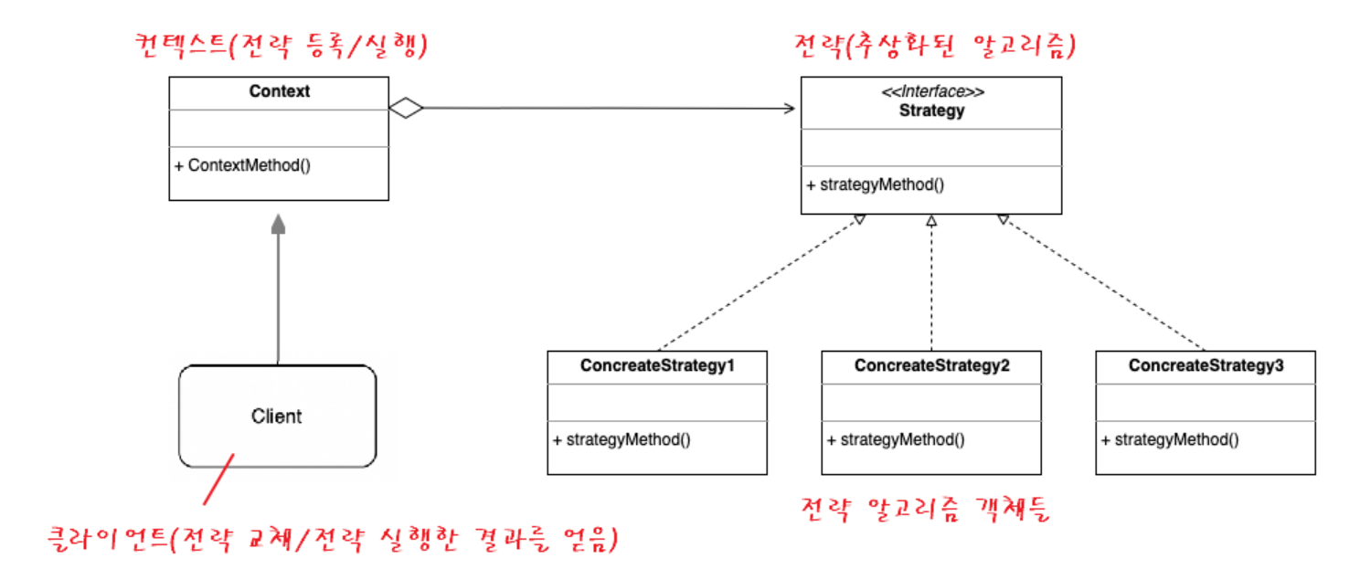 클라이언트 : 특정 전략 객체를 컨텍스트에 전달함으로써 전략을 등록하거나 변경하여 전략 알고리즘을 실행 결과를 얻음