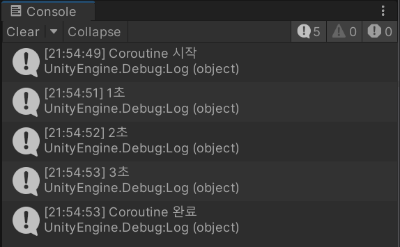 yield return new WaitForSeconds(float); // 지정한 초 만큼 대기