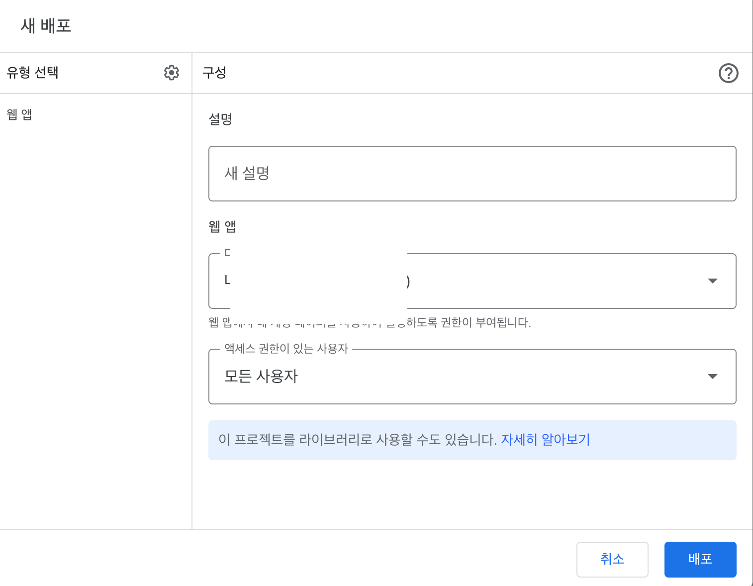04 연결되면 배포 → 웹에 게시를 클릭하여 모든 사용자 접근 허용으로 설정한다.