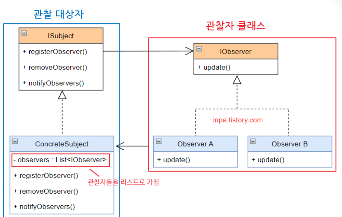 Subject의 역할은 관찰자인 Observer들을 내부 리스트에 등록/삭제하는 인프라를 가지고 있다. 그리고 상태를 변경하거나 어떤 동작을 실행할때, Observer들에게 알림을 발행한다.