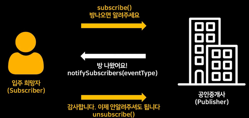 1 : N 종속 관계를 구현하는데 사용되는 패턴이다. 한 객체의 상태 변경이 다른 여러 객체에게 알려지고 자동으로 업데이트 될때 사용된다. 예를 들어 유뷰트 채널은 발행자(Subject)이 되는거고 구독자들은 관찰자(Observer)가 되는구조로 보면 된다. 유튜버가 영상을 올리면 여러 명의 구독자들은 모두 영상의 알림이 간다. 하지만 구독을 취소한 경우에는 알림이 가지 않는다.